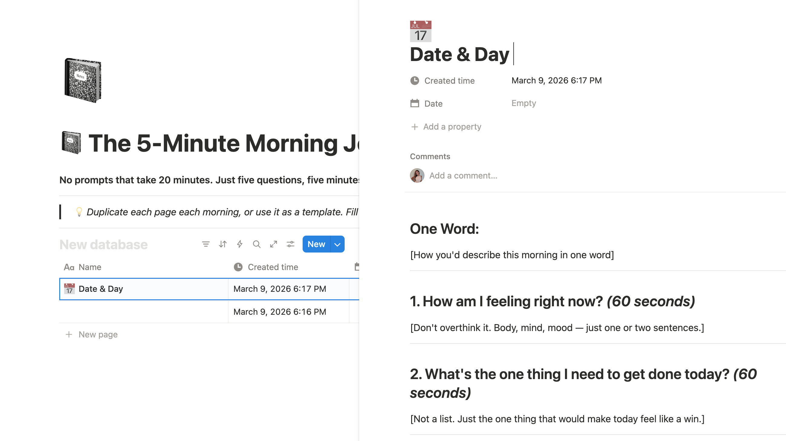 Try it: Keep your journal on your pillow so it is the first thing you see when you wake up. Friction reduction is the whole system. If you want a digital version, you can download my 5-Minute Morning Journal Template on Notion.